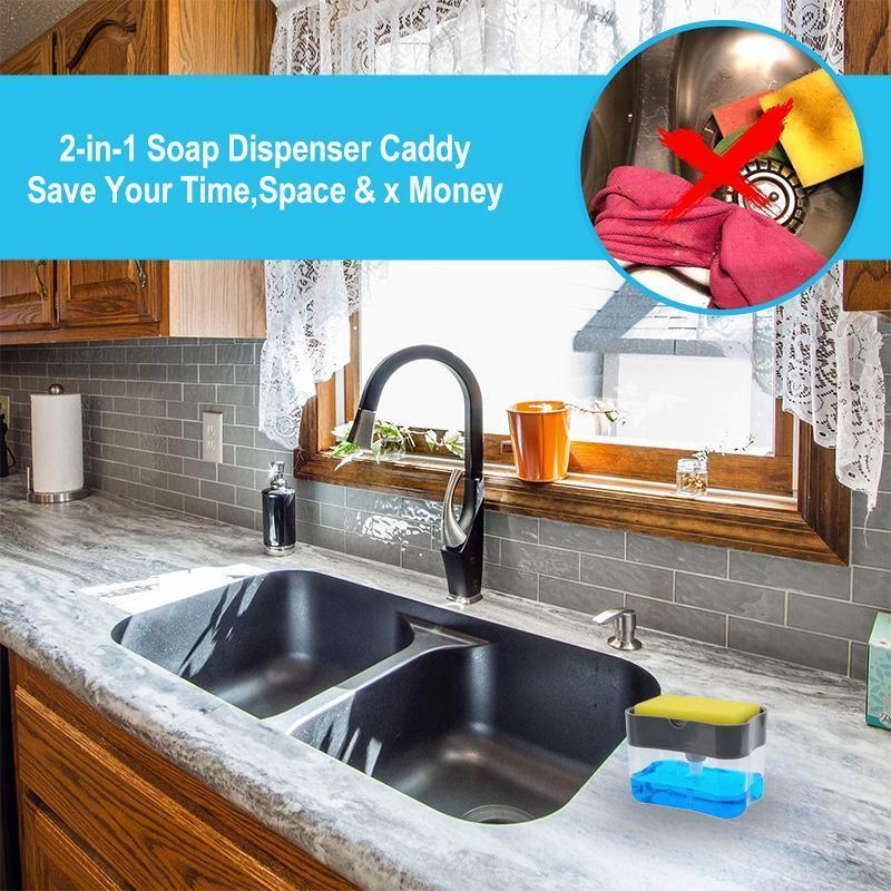 INSTANT 2 IN 1 DISPENSER + CADDY, ONE HAND OPERATION, COMPACT ORGANIZATION: Sink dispenser with attached caddy holds sponges, scrubbers, rags, scouring pads in one convenient place while keeping water off of kitchen counters. NO Messy Spills, Dripping or Trailing.