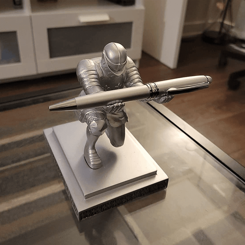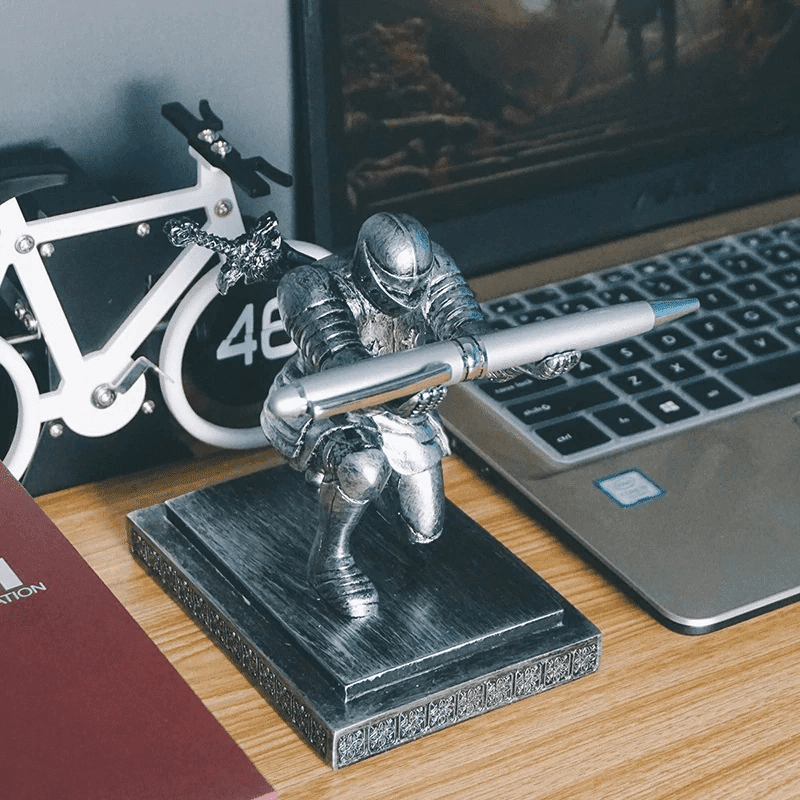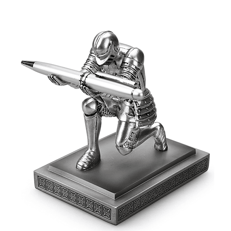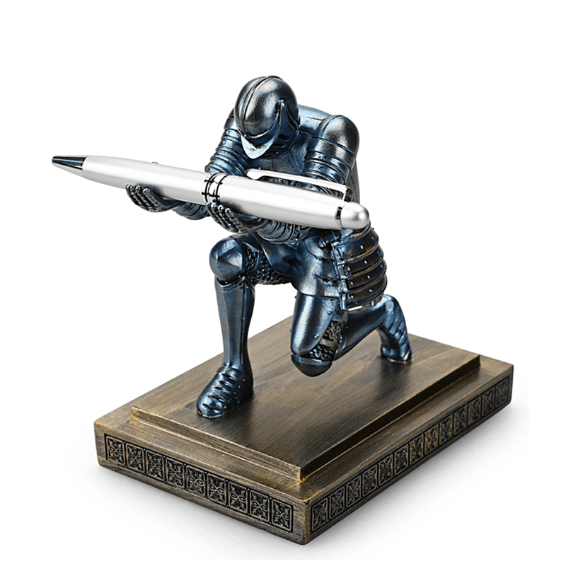 This Knight Pen Holder is a unique statue for your office that depicts a medieval knight bowing down and holding out your pen for you as if you were his King and the pen is your sword. He bows down in front of you presenting you your pen, and you can almost hear him whispering to you: "Your Pen, Your Majesty"