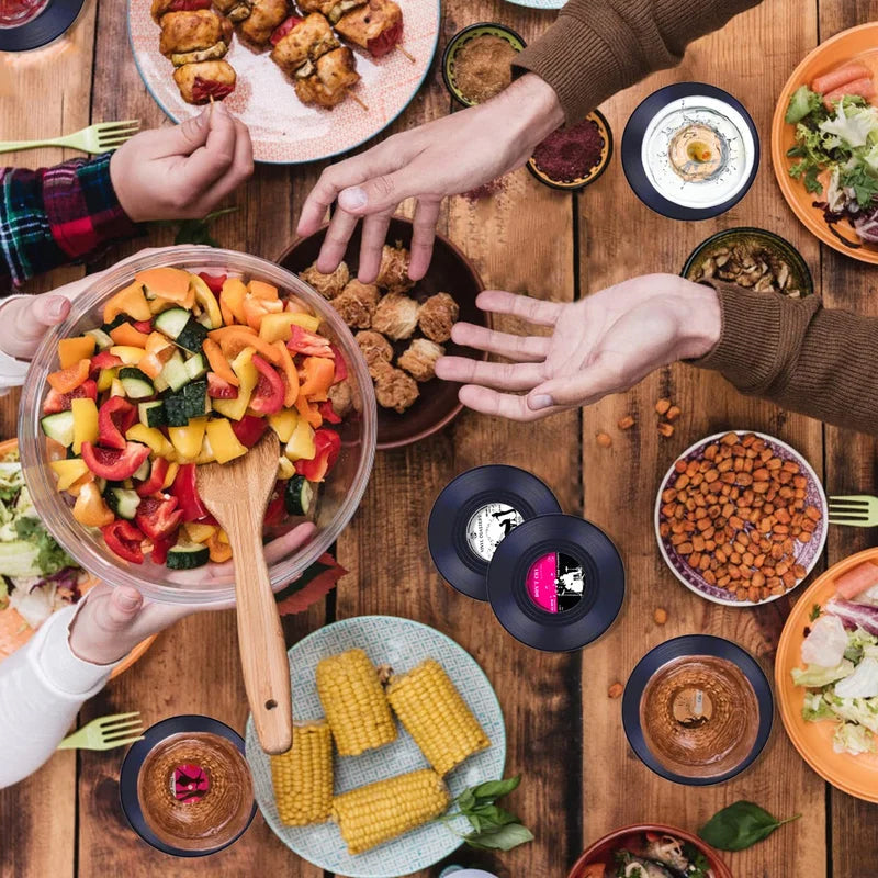 Materials: Jolumros vinyl record disk coasters non-toxic and non-slip. Each coaster is 4.1" and fits any cups. Easy to clean and storage.