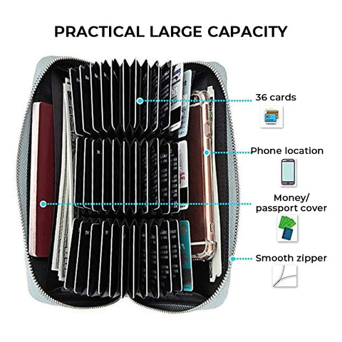 Large capacity: 36 card slots + 2 cash slots + 2 inner pockets. The size of the RFID wallets is 21*12*6 cm. There is plenty of room for your checkbook, cash, smartphone, credit cards, debit cards, ID cards, student ID cards, and many other types of cards.