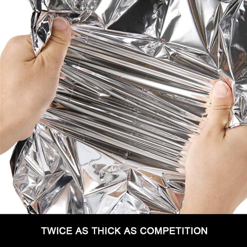 - ► LARGE & DUAL REFLECTIVE SURFACE – Dimensions of 82” x 52” can accommodate up to 6’ 5” tall adults, very light 2oz each, effective addition to your thermal control gear, reflects back up to 90% of your body heat, 12-micron aluminized polyethylene mylar, resistant, windproof, waterproof, moisture proof, dual reflective sides for rescue signaling.