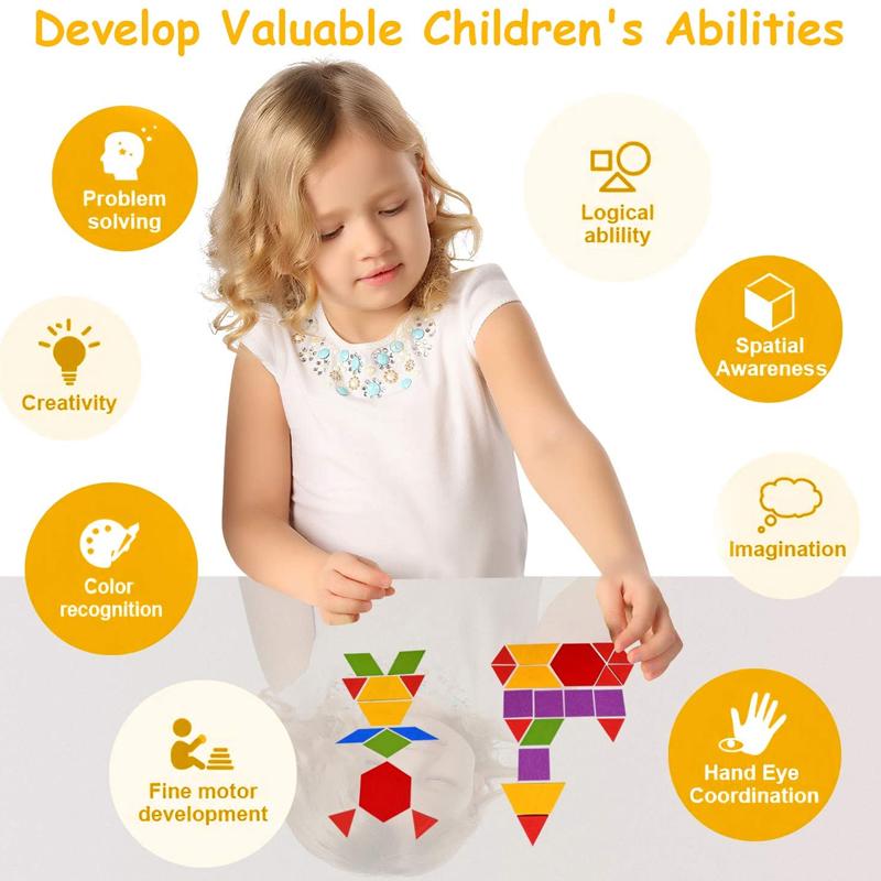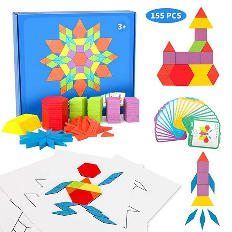 - 155 pieces of pattern block set - 155 pieces of pattern blocks with 6 different sturdy shapes and colors, including 24 design cards and 1 storage bag