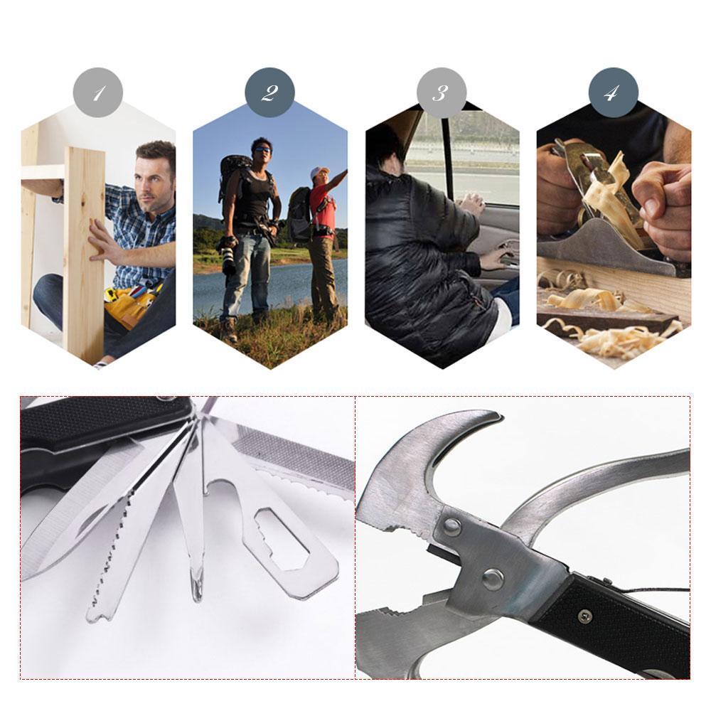 - Multi-function, axe, hammer, pliers, Phillips head screwdriver, saw, broach, slotted screwdriver, wrench, wire cutter, plug connector, bottle opener, tool with safety lock.